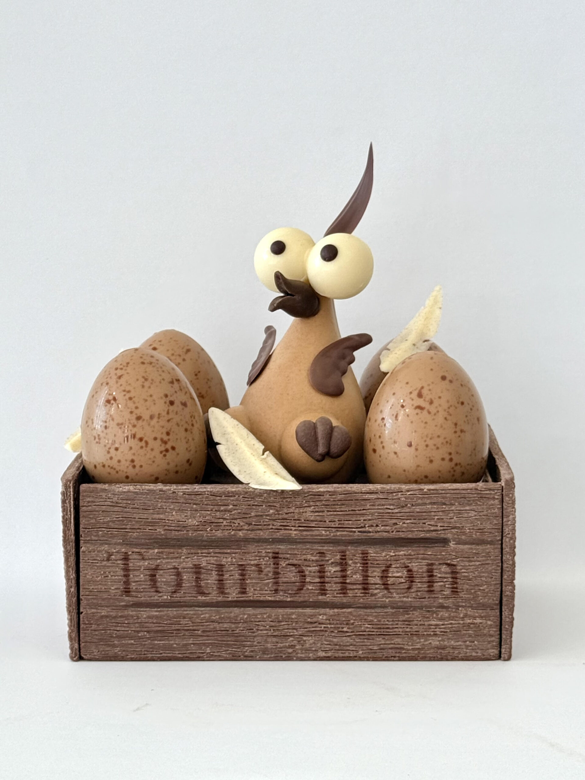 Création pour Pâques, œufs garnis de chouchous noisettes, petits œufs pralinés … et pour un plaisir jusqu’à la dernière bouchée, même la cagette se mange !