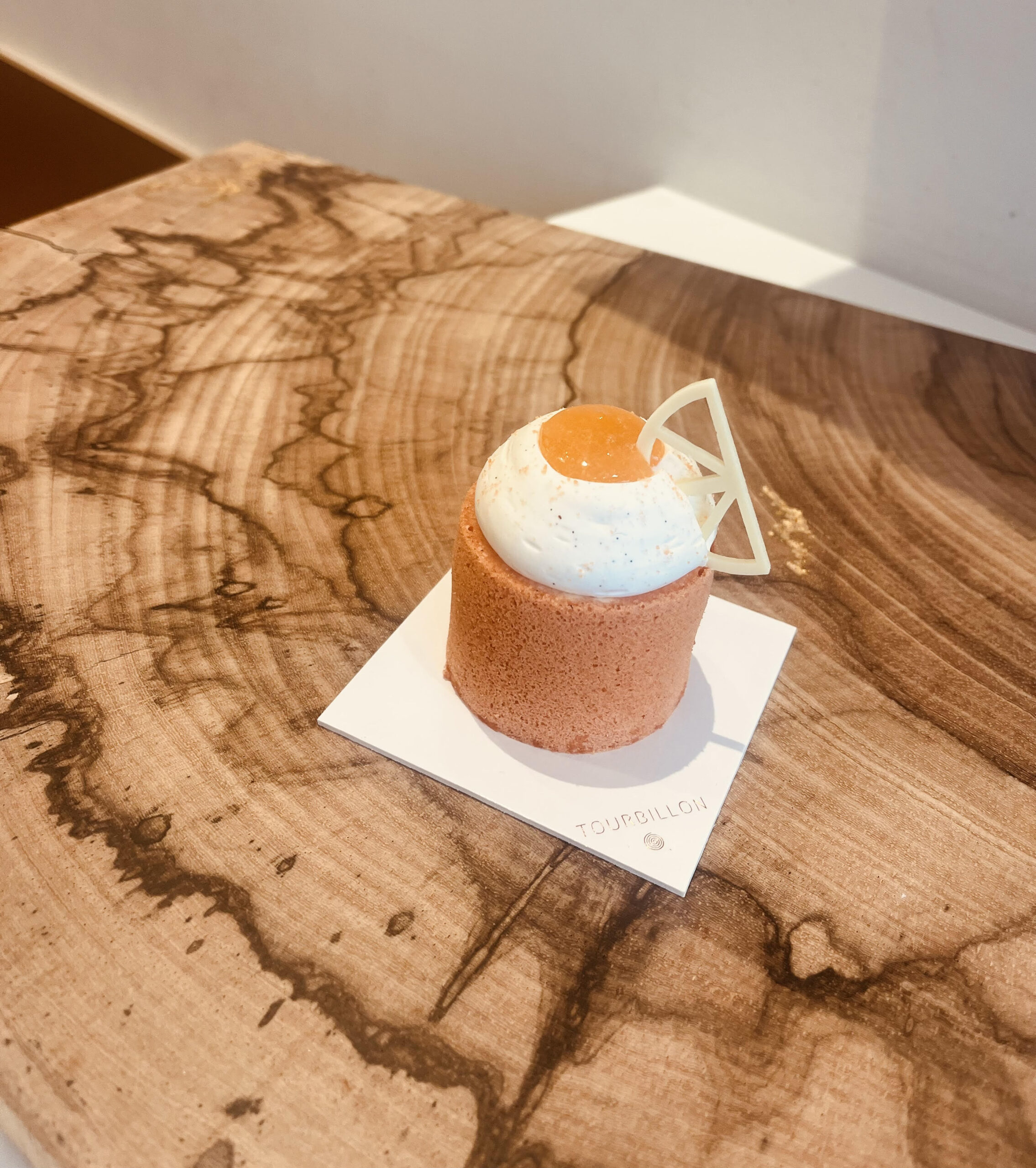 Biscuit joconde aux amandes, sablé pressé croquant, confit de d’agrumes, crème légère au cream cheese et mascarpone.