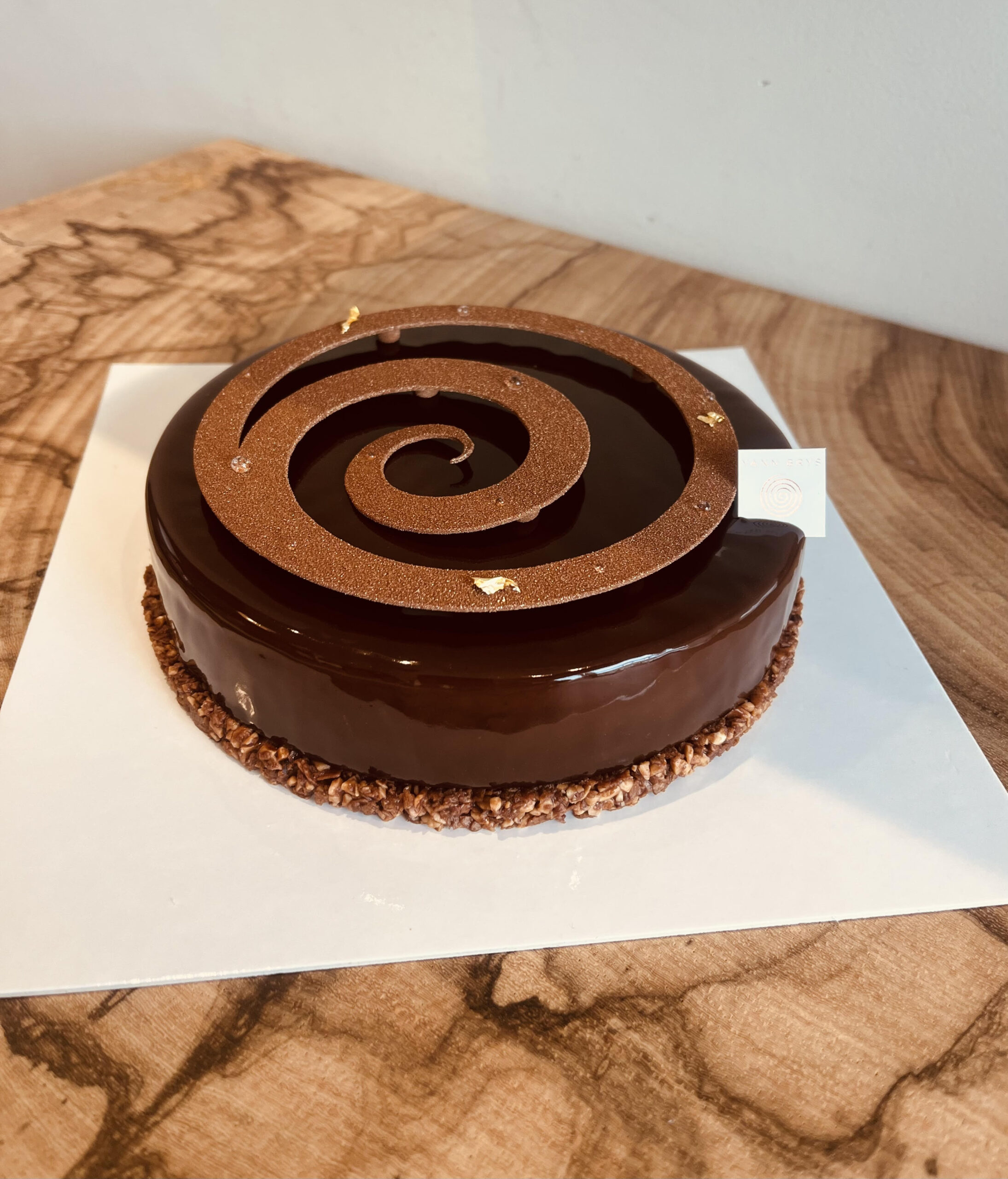 Croustillant noisette, feuilletine, biscuit moelleux noisette, praliné noisette, crémeux noisette, mousse chocolat noir